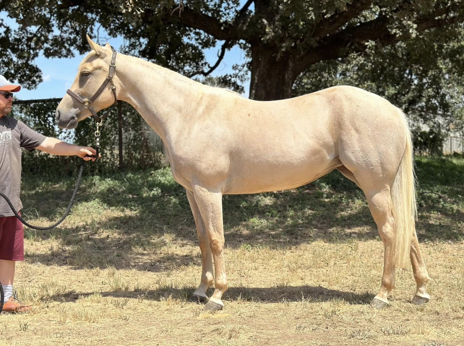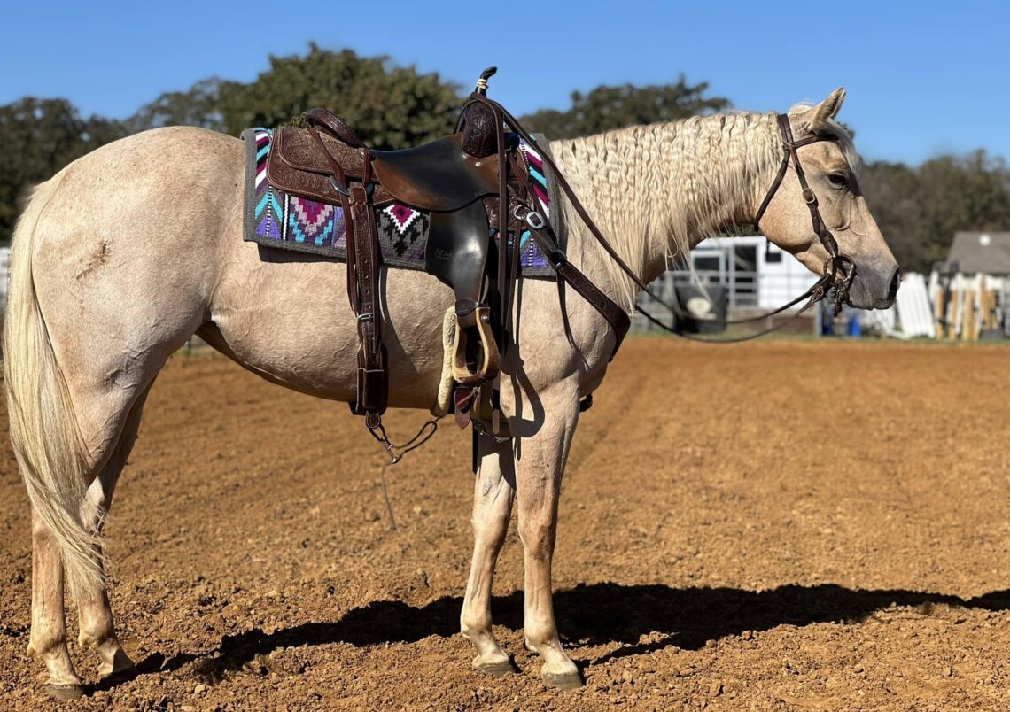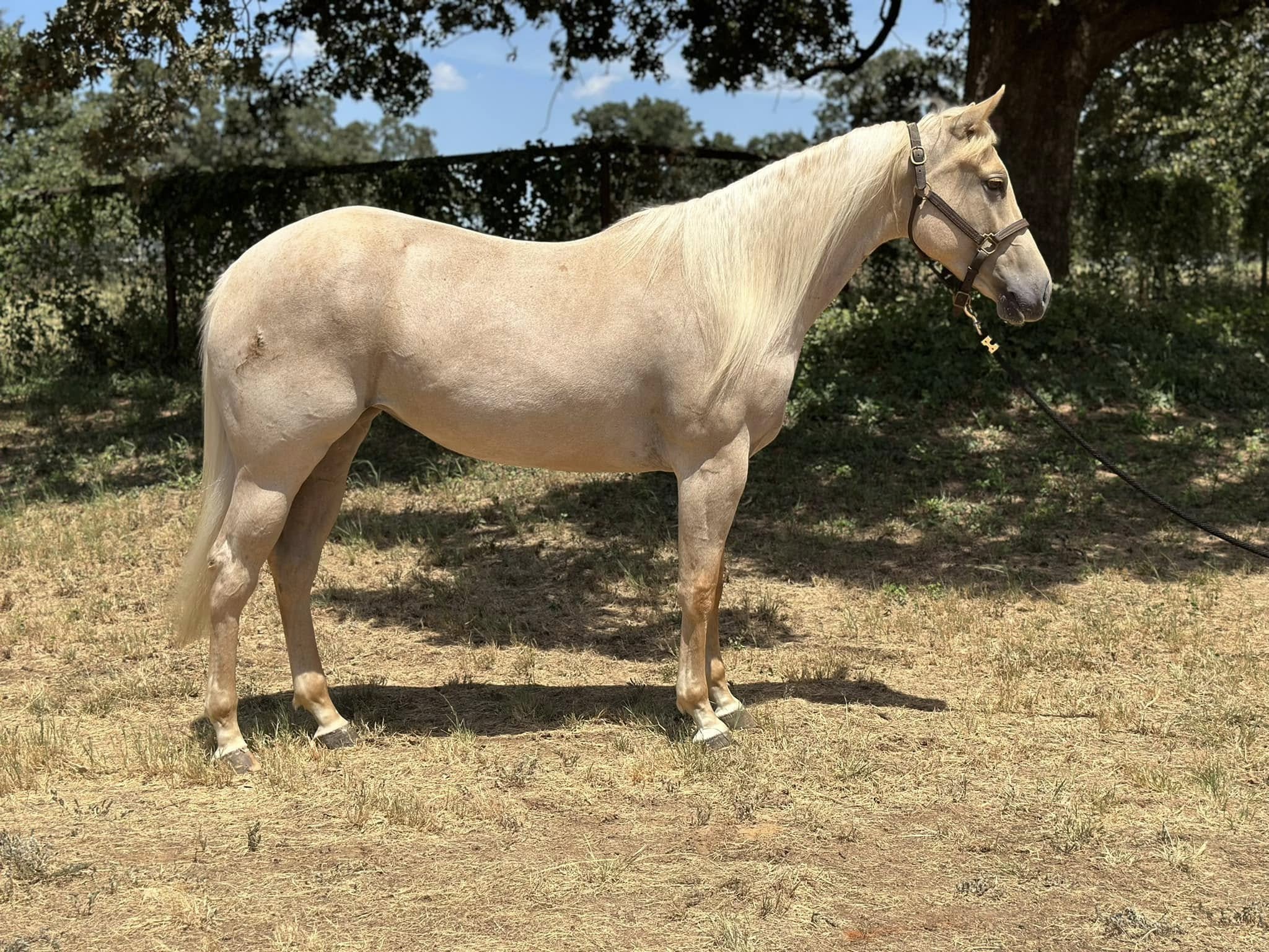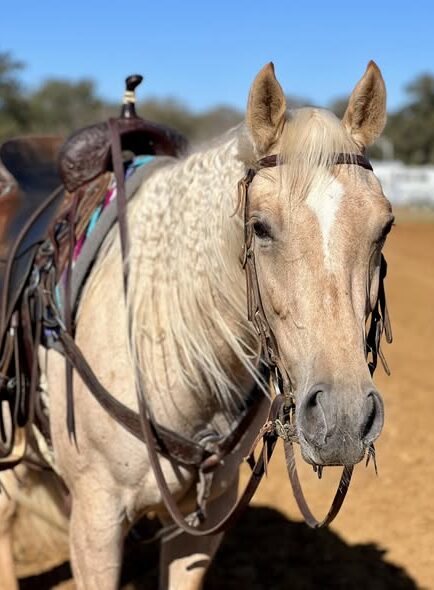 "Rose" is a stunning huge palomino mare. She turns heads everywhere she goes! She has the sweetest disposition and loves attention. She has been used for trail riding, roping, ranch work, sorting cattle and has been lightly started as a polo pony. She is so pretty under English or western tack and would make an awesome low level dressage mount! Watch all her bridle-less videos. She wants to be so quiet, steady and smooth. She has a sweet jog and smooth easy lope, correct turn arounds, side passes, backs up, works a gate, and melts into a hard stop whenever asked. She neck reins, direct reins and takes more contact well. She is easy to catch, bathe, tack up, stands for mount and dismount, ties, leads loads hauls, and super about new places and situations